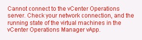 "Cannot connect to the vCenter Operations server. Check your network connection, and the running state of the virtual machines in the vCenter Operations Mannager vApp.