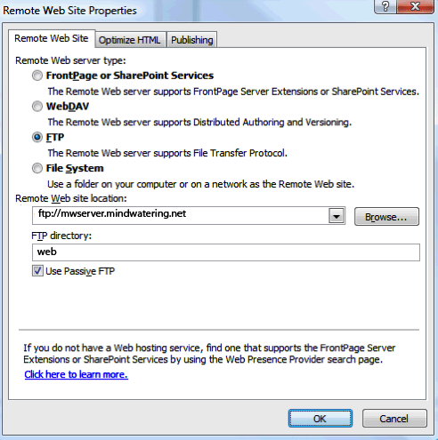 This command opens up the the publish dialog box. This is where you give FrontPage the information it needs to know to send your files to the server using FTP.