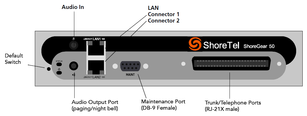 - 1 RJ-21X male connector for mass termination of the telephone/trunk ports