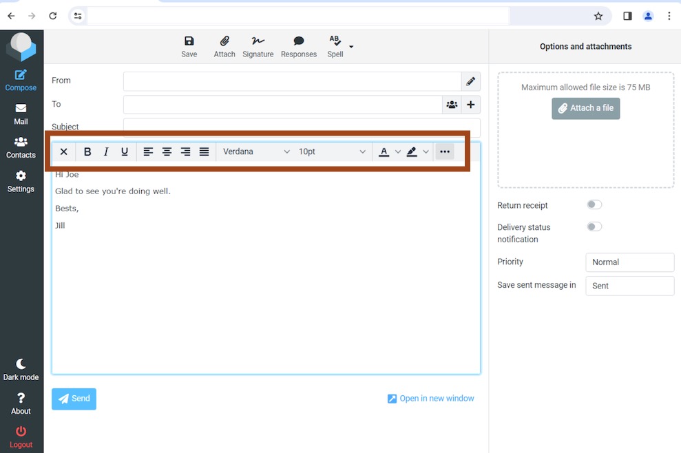 Roundcube does not display the full style bar, with font and text options such as bold, italic, underline, left-, left- center- full-justified, etc. Instead, Roundcube shows only back, forward, attach, insert image, and paragraph style.