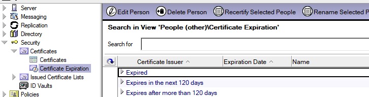 To renew the ID certificate, open the Expired or Expires in the next 120 days, and select the person desired. If you select more than one person, make sure they all share the same stamping O or OU certifier.
