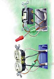Now go downstairs and pull a piece of new cable from the existing wall outlet up to the new switch hole. Attach the two black (hot) wires to the switch, as illustrated, and then join the two white (neutral) wires with a twist-on connector. Finally, join the two bare wires with a "greenie," a wire connector with a hole in its end. Snip one of the bare wires several inches longer than the other. Slip the greenie over the long wire and twist together the two bare wires. Then, secure the long pigtail wire protruding out of the greenie to the grounding screw on the switch.