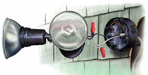 Light up your life — or at least your backyard — with a floodlight. Our installation solves a common problem: A deck without adequate lighting for itself, a staircase, or the adjacent yard. The solution called for installing a two-lamp floodlight ($12) high up on the house wall. As with most electrical upgrades, this one relies on tapping into an existing circuit. If you're not sure whether or not a circuit can support the upgrade, check with an electrician. An overloaded circuit is a fire hazard.