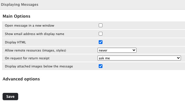 Under the Main Options of the Displaying Messages page, update the field: Allow remote resources (images, styles)