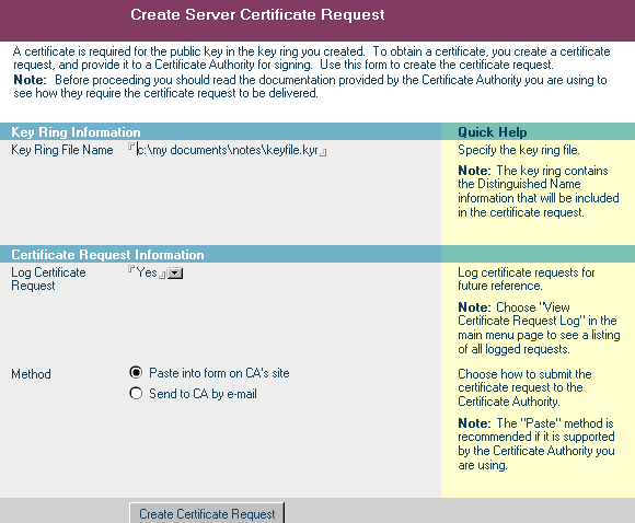 The form should already be filled in correctly but confirm the file name and path of the Key Ring file. Now use the Create Certificate Request button. You will be prompted for the Key Ring password and then you will see Figure 3.