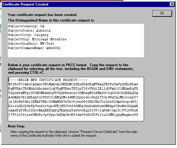 Now you need to move to the Verisign web site (www.verisign.com) or to the Canadian representative of Verisign (www.cibc.com/verisign). You pick the kind of server ID you need (we chose Secure Site). You will need to prove who you are. This can be done electronically with a DUNS number, or you can fax business license or articles of incorporation (F: 877/862-2270). At the point where they ask for your CSR, you can use <ctrl – v> to paste in your certificate request that you copied to the clipboard. Once you have completed the process without error, a wait from 2 hours to several days to receive your requested certificate is expected. I should mention that I called CIBC Verisign support (877/291-3111) and asked how long the process would take, and they said that if it was important they would do it right now. It was completed in about 1.5 hours.