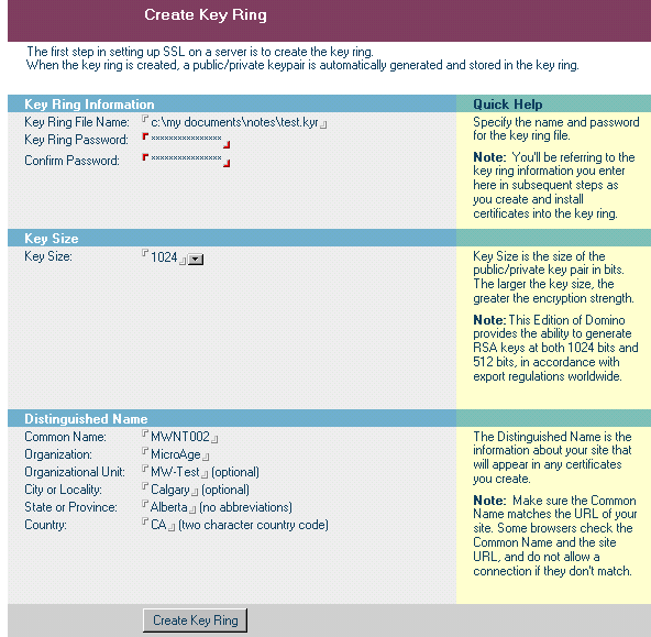 You will need to use 12 characters or more for the password. Always use the 1024 key size. In the Common Name field you need to have the exact name of your server, such as www.microage.ca. In this case we see my test server, which is mwnt002 (and is defined not in DNS but in a host table on the machines connected). Organization is the name of your organization (that you work for). The Organization Unit should be your Domino domain. The last three fields are logical. Now use the Create Key Ring button to generate your ring.