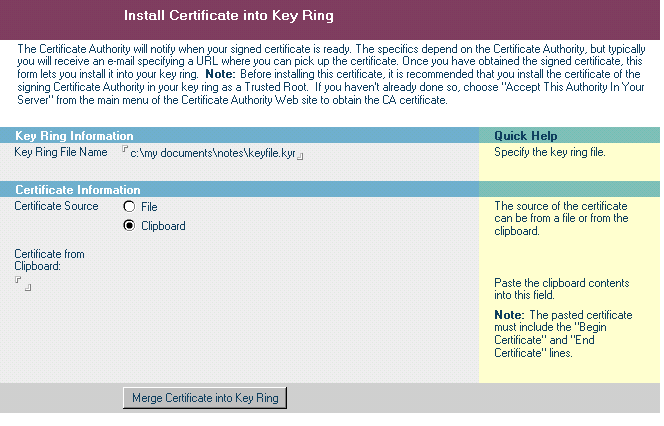 Now you need to copy and paste the certificate into your Key Ring. So once more open the Server Certificate Admin application. Now choose option 4 – Install Certificate into Key Ring. Now in Figure 5 you can see where to paste the certificate you were emailed. Before pressing the Merge Certificate button, ensure that the file name and path at the top of the screen is correct.