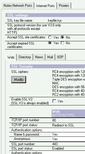 Now you need to work in the Domino Directory, Servers view. Open the server you are going to enable SSL on (and have copied the two key files to). Select the Ports tab, and then the Internet Ports tab. Now in figure 6 you can see that the SSL key file name should already be correct. You can change the SSL protocol version to only support V3.0 of SSL to take advantage of the new features.