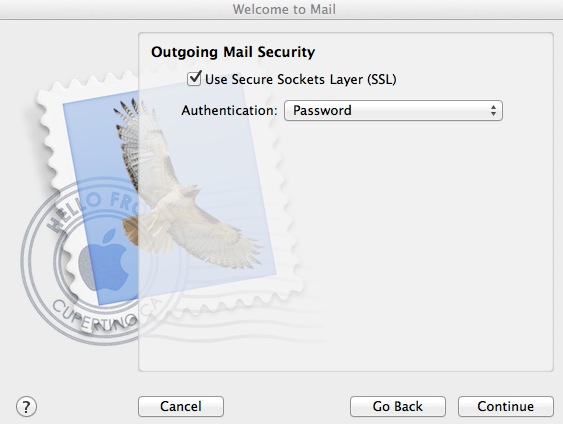 If you are using OS X 10.8, and get a message that the SMTP server is not responding, deselect the checkbox option Use only this server and click Continue again. You will have an extra screen to complete. We are working around a bug in the application. (It actually doesn't seem to matter if you start out selected or not selected for this box - it fails. So you toggle the selection and continue to get to the next screen.)