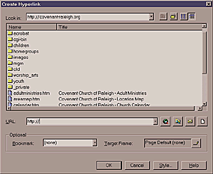 3. In the hyperlink dialog box (see image far below), select the page you wish to link to in the upper box containing your web site's folders and files.