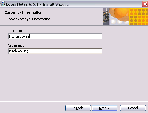 A dialog box/wizard should have appeared. The dialog box is asking your for your Lotus Notes name and the Domino server's Notes name.