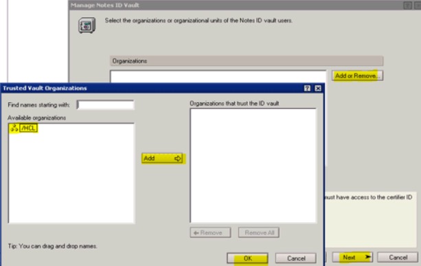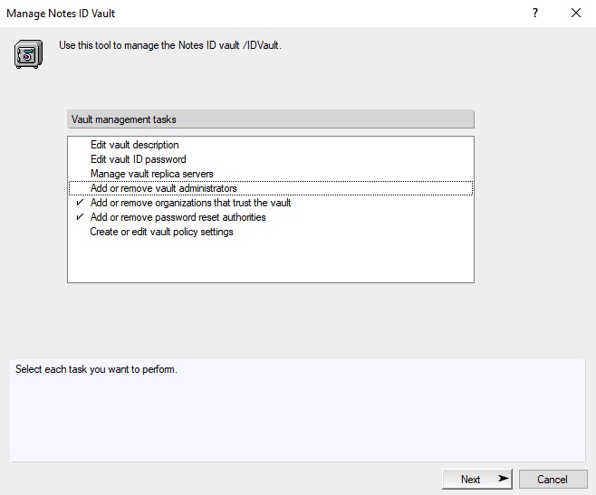 5. In the Manager Notes ID Vault dialog, select the two options: