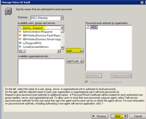 7. In the Manage Notes ID Vault dialog, and the Specify names that are authorized to reset passwords page, add back the authorized folks if they are not already added.