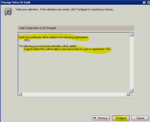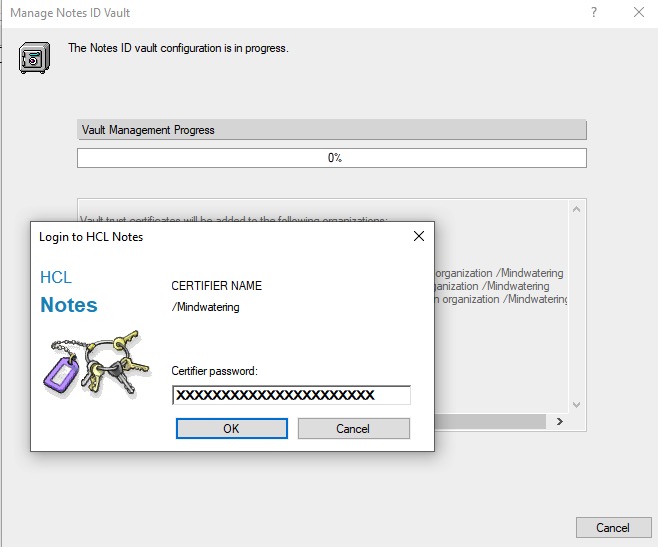 9. In the Manage Notes ID dialog, on the The Notes ID vault configuration is in progress page prompts for the certificate ID file and the password.