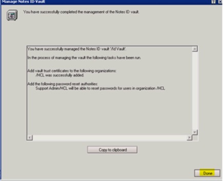 10. In the Manage Notes ID Vault dialog, on the You have successfully completed the management of the Notes ID vault page, click Done.