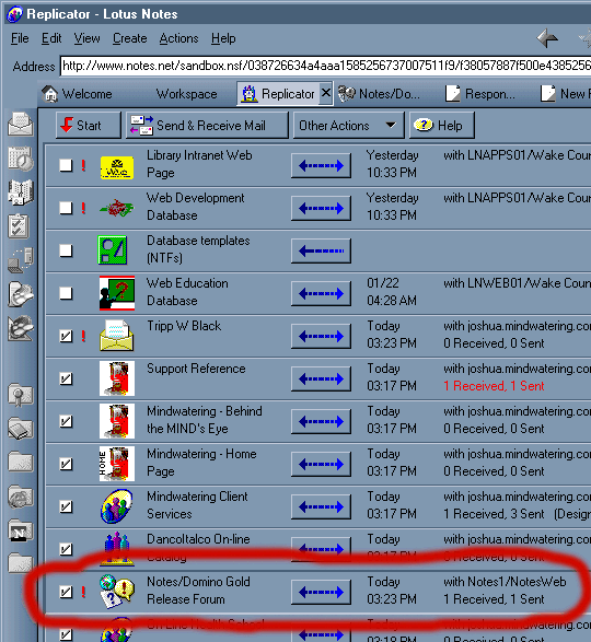 - The box at the left that is checked means it is included in the automatic replication set up for my Notes Client. (That schedule is set up in the location document.) I have multiple ID's that I use (depending which company I am working for at the moment. So my replication depends on which location/ID I am at a given time.)